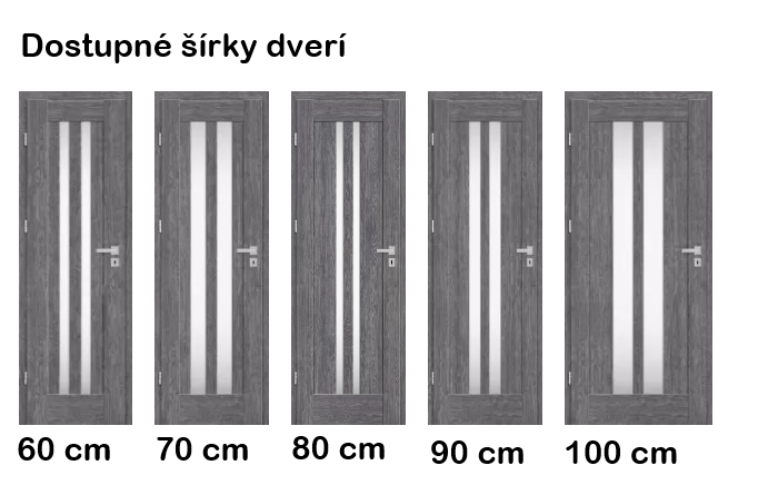 Dveře na obrázku jsou znázorněny v šířce 80 cm. U jiných šířek jsou výrazné rozdíly v proporcích skel. V případě zájmu o vizualizaci dveří v jiné šířce nás neváhejte kontaktovat!