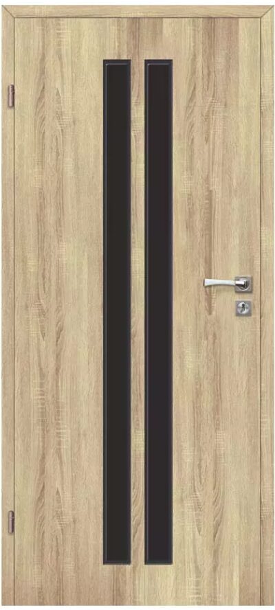 Dveře Torino 10 okamžitě upoutají pozornost díky svému dominantnímu prvku: úzkému vertikálnímu pásu z matného tvrzeného černého skla. Tento detail dodává křídlu hloubku, moderní kontrast a špetku luxusu.