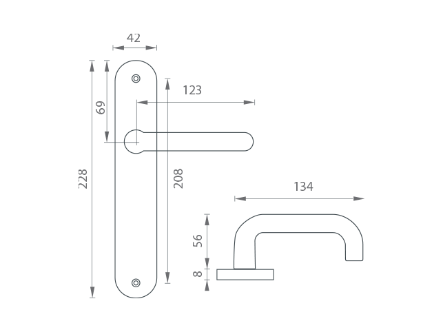 Štítová klika na interiérové dveře s oválným štítem je vyrobena z hliníku a je povrchově upravena. Klika neobsahuje vratný mechanismus.